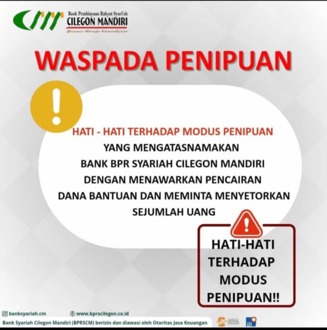 Sebagai Badan Usaha Milik Daerah (BUMD) Pemerintah Kota Cilegon, BPR Syariah Cilegon Mandiri menegaskan adanya oknum tidak bertanggung jawab yang menawarkan pencairan dana bantuan dengan mengatasnamakan bank, namun disertai permintaan penyetoran sejumlah uang kepada masyarakat.