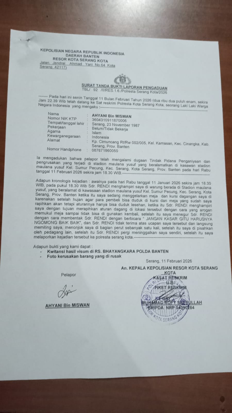 Serang, Matamedianews.co.id,- Sejumlah pedagang kuliner di kawasan Stadion Maulana Yusuf, Kota Serang, melaporkan dugaan tindakan arogan yang dilakukan oknum Satgas Dinas Pemuda dan Olahraga (Dispora) Kota Serang berinisial R ke Polresta Serang, Rabu (11/2/2026).