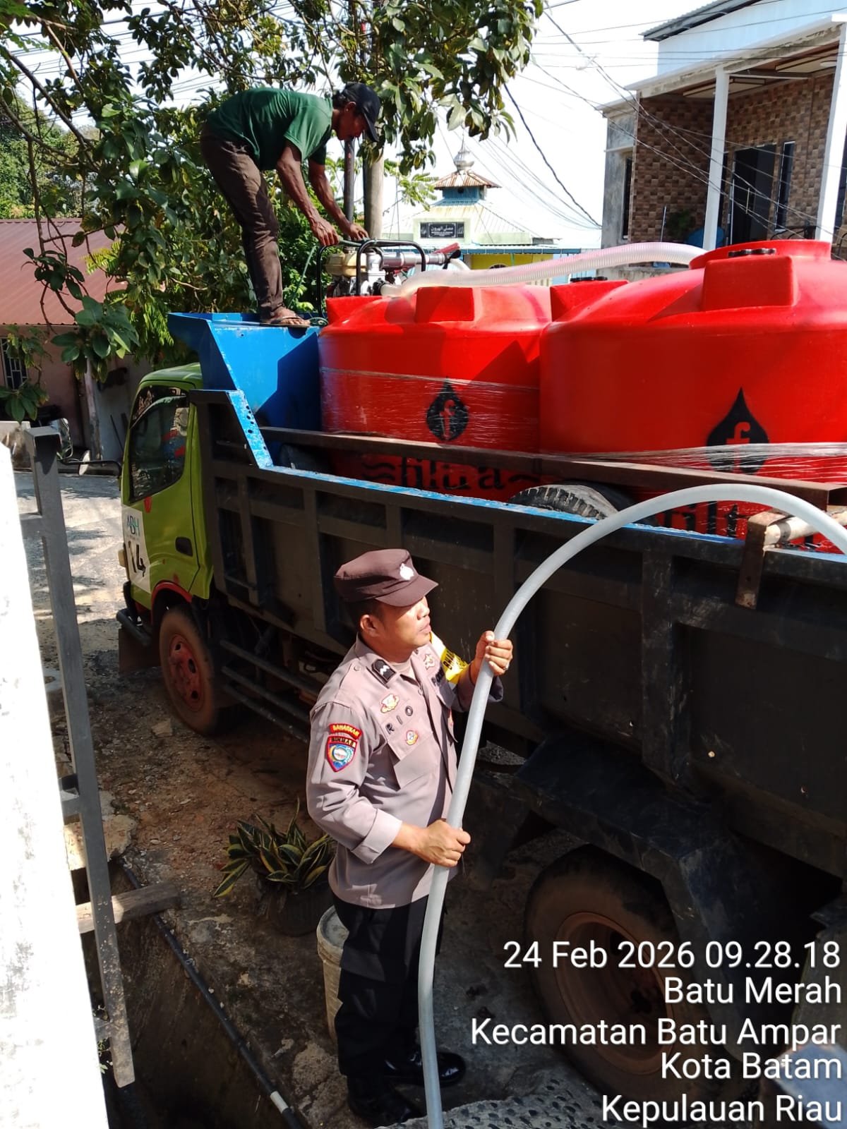 Polsek Batu Ampar melaksanakan kegiatan pengamanan pendistribusian air bersih dari Pemerintah melalui PT. ABH kepada masyarakat yang terdampak gangguan suplai air di Kelurahan Tanjung Sengkuang, Kecamatan Batu Ampar, Kota Batam.