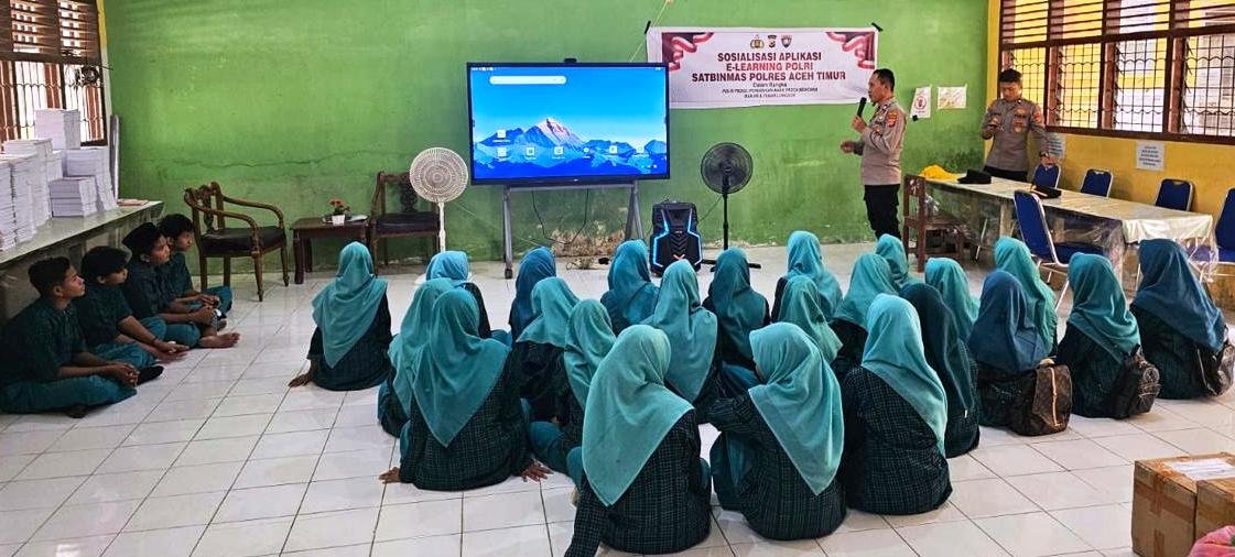 Aceh Timur-Satuan Pembinaan Masyarakat (Satbinmas) Polres Aceh Timur, Polda Aceh menggelar sosialisasi penggunaan aplikasi pembelajaran digital E-Learning kepada para siswa di SMP Negeri 1 Peureulak, Kamis (05/03/2026) pagi. Kegiatan itu bertujuan mendorong pemanfaatan teknologi sebagai sarana belajar, terutama bagi siswa yang terdampak situasi bencana.