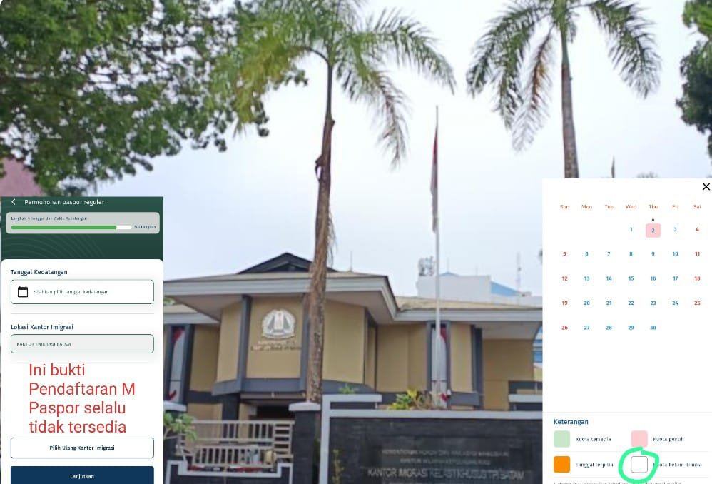 Della salah satu warga Batam, mengungkapkan kejanggalan yang ia alami saat mencoba mendaftar melalui aplikasi resmi M-Paspor. Menurutnya, kuota layanan hampir selalu berstatus “tidak tersedia” (ditandai warna putih), namun dalam hitungan jam berubah drastis menjadi penuh (warna merah), tanpa pernah memberi kesempatan bagi masyarakat untuk mendaftar.