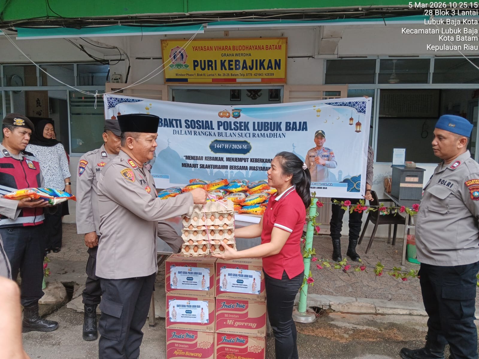 Polresta Barelang – Dalam rangka menyemarakkan Bulan Suci Ramadhan 1447 H/2026 M, jajaran Polsek di wilayah Polresta Barelang melaksanakan kegiatan bakti sosial berupa pemberian bantuan sembako kepada panti jompo serta pembagian paket takjil kepada masyarakat. Kegiatan ini dilaksanakan oleh Polsek Lubuk Baja dan Polsek Sagulung sebagai bentuk kepedulian Polri kepada masyarakat serta upaya mempererat hubungan silaturahmi dengan warga. Kamis, (05/03/2026).