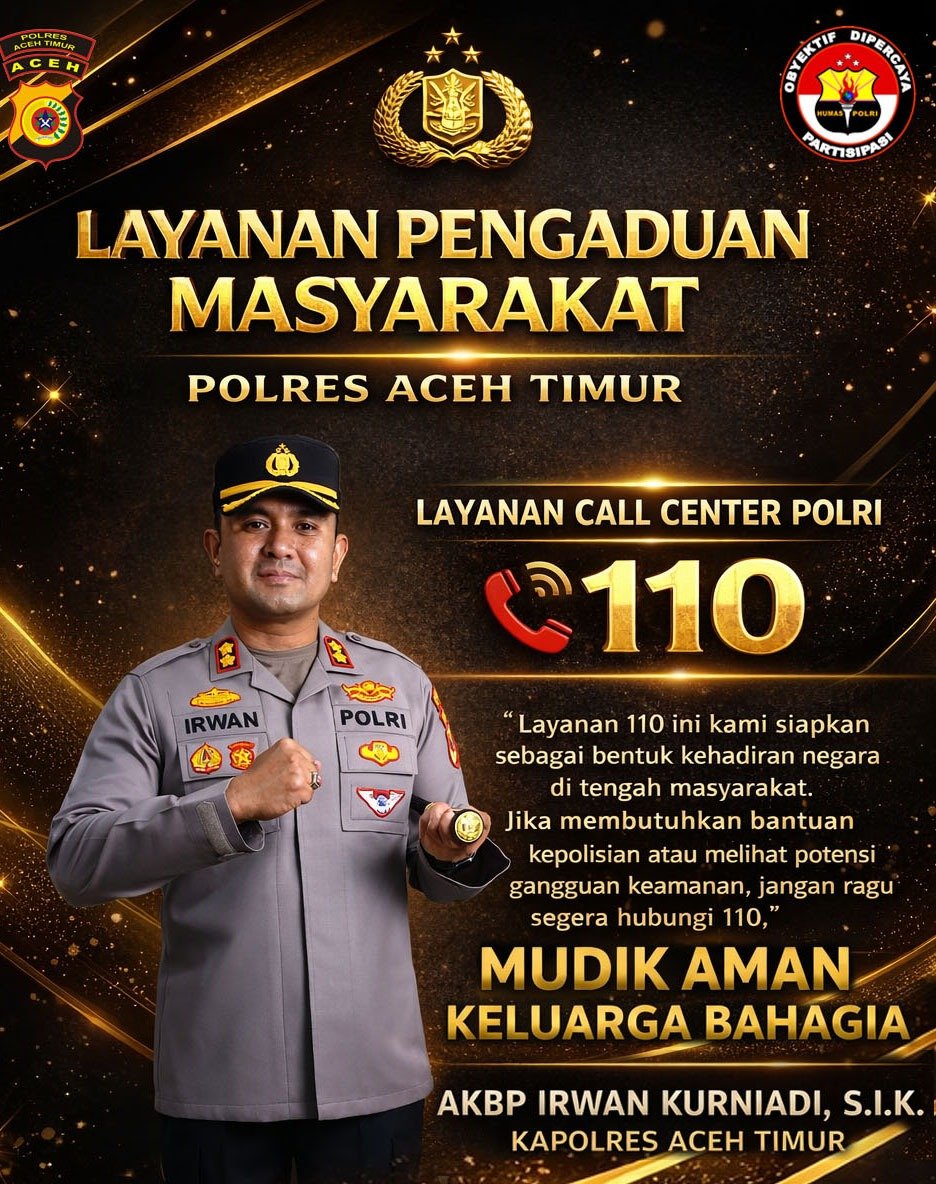Aceh Timur-Polres Aceh Timur, Polda Aceh mengajak masyarakat untuk memanfaatkan layanan hotline Polri 110 sebagai saluran cepat pelaporan dan permintaan bantuan kepolisian, khususnya selama Ramadhan 1447 Hijriah hingga momentum Lebaran 2026.