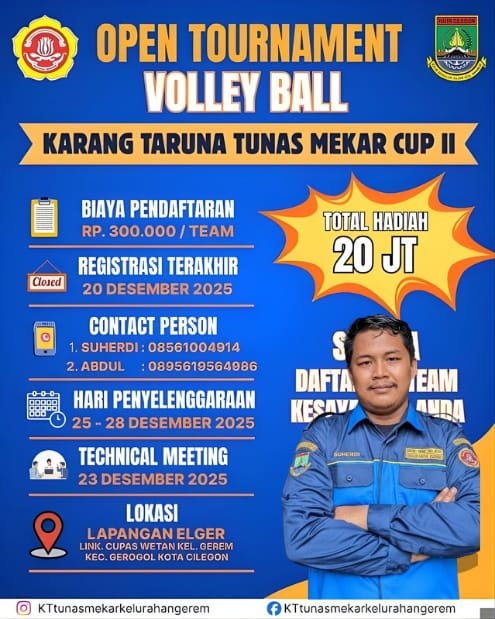 Cilegon,- Matamedianews.co.id,- Gairah olahraga kembali memuncak di Kelurahan Gerem, Kecamatan Grogol, Kota Cilegon, dengan digelarnya Open Tournament Volley Ball Karang Taruna Tunas Mekar Cup II. Turnamen yang menawarkan hadiah total hingga 20 Juta Rupiah ini diinisiasi oleh Karang Taruna Tunas Mekar Gerem dan akan dipusatkan di Lapangan Elger, Lingkungan Cupas Wetan.
