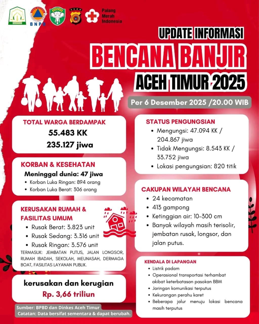 Aceh Timur -Banjir yang melanda 24 kecamatan di kabupaten Aceh Timur, berdasarkan data bersifat sementara per 6 Desember 2025 masuk diperkirakan total warga terdampak 55.484 KK dan 235.127 jiwa dari cangkupan wilayah bencana 24 kecamatan desa terkenak banjir 413 Gampong dari total 513 Gampong.minggu (7/12/2025)