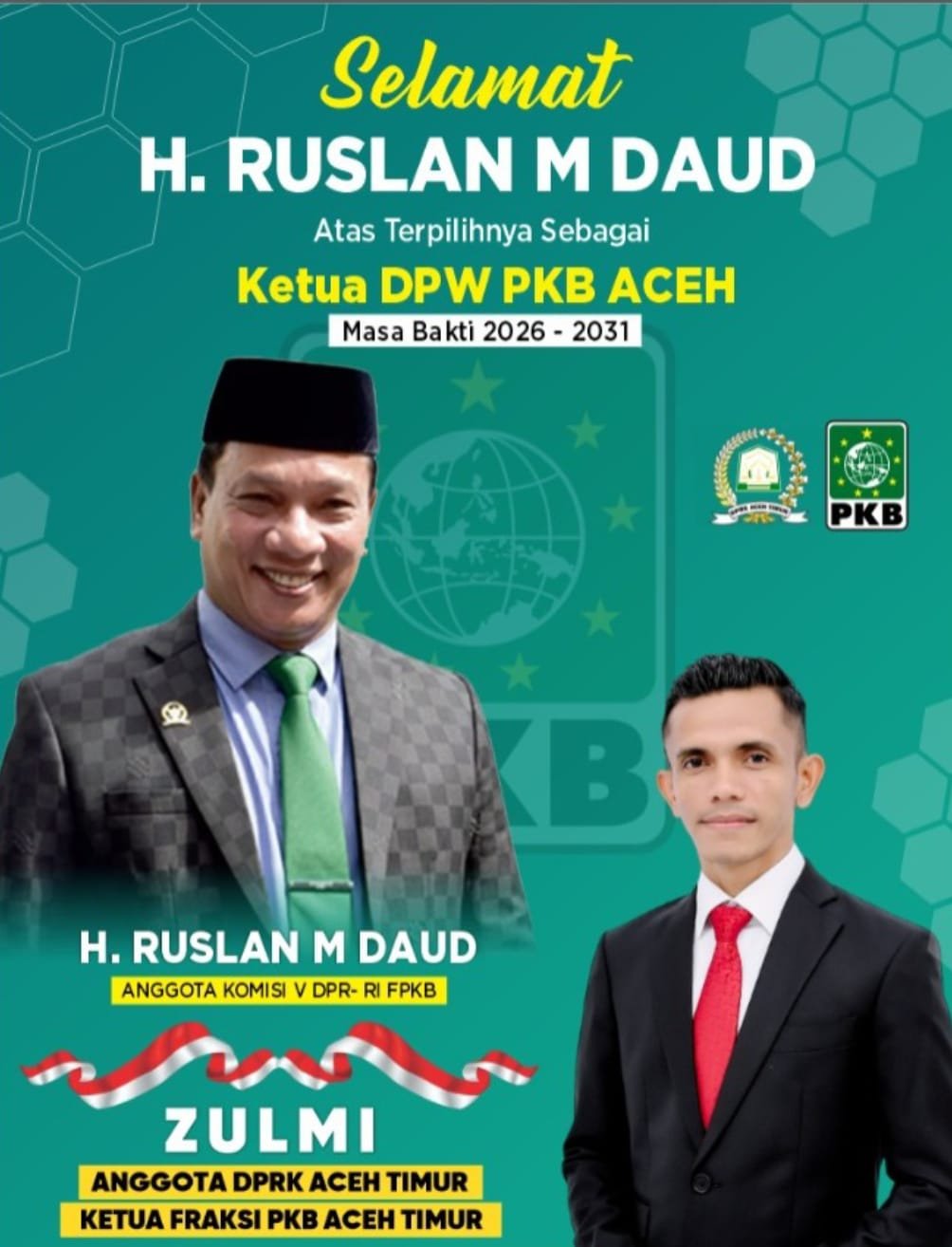 Aceh Timur-Zulmi anggota DPRK Aceh Timur yang juga Ketua Fraksi partai PKB menyampaikan ucapan selamat dan apresiasi yang setinggi-tingginya kepada Bapak H. Ruslan M. Daud, S.E., M.A.P. atas penetapannya sebagai bagian dari Dewan Pengurus Wilayah (DPW) Partai Kebangkitan Bangsa (PKB) Provinsi Aceh masa bakti 2026–2031.